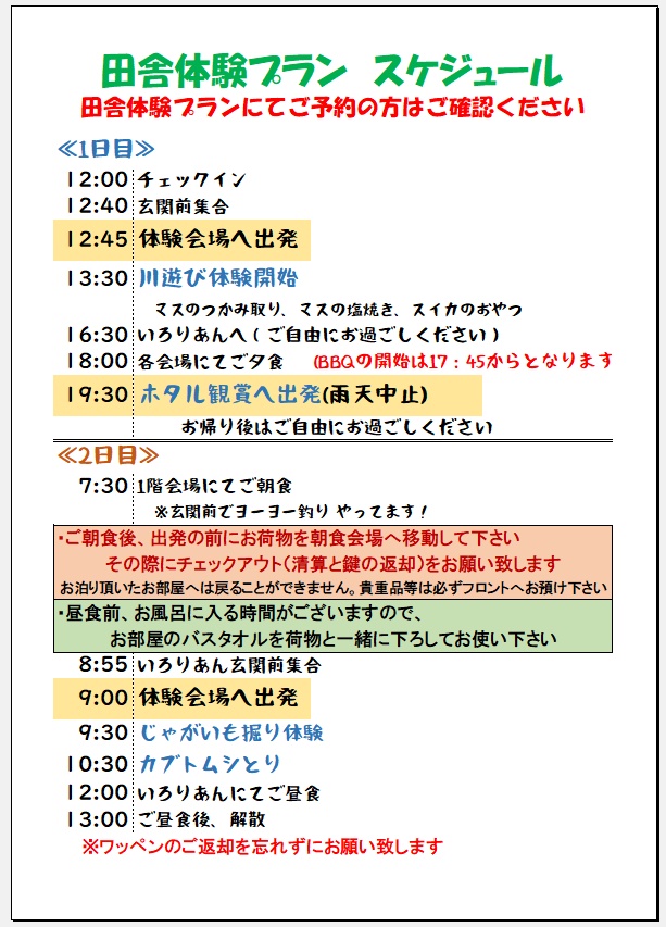 田舎体験ツアー目前!当日のスケジュールを大公開! 2024.07.17 いよいよ夏本番、田舎体験プランの開始が間近となって参りました! そこで今回は、田舎体験プラン当日のスケジュールをおしらせ致します! 田舎体験プランは当日午後~翌日お昼までのプランとなっております。 今年度の田舎体験の開催は7月26.27.28日と8月8日~17日ご宿泊までになります、 皆様のお越しをお待ちしています。 < 前の記事へ 記事一覧へ 次の記事へ > 最近の投稿 気の早いお話ですが 新年あけましておめでとうございます。 お願いです 雪の備えを 紅葉が進んでいます 月別アーカイブ 月を選択 2026年3月 (1) 2026年1月 (1) 2025年12月 (1) 2025年11月 (1) 2025年10月 (2) 2025年9月 (1) 2025年8月 (2) 2025年7月 (2) 2025年6月 (2) 2025年5月 (1) 2025年4月 (1) 2025年2月 (1) 2025年1月 (2) 2024年12月 (4) 2024年7月 (1) 2024年6月 (2) 2024年5月 (3) 2024年4月 (1)